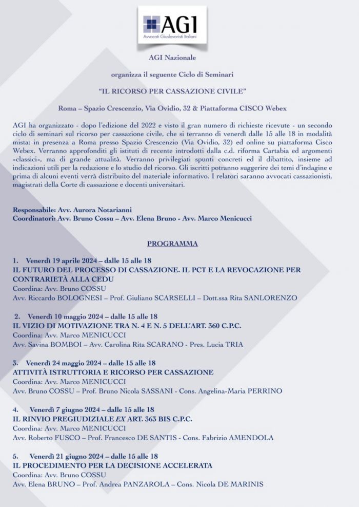 Venerdì 19 aprile, dalle 15:00 alle 18:00, in Spazio Crescenzio (Via Ovidio, 32) avrà luogo il primo appuntamento del Ciclo di Seminari organizzato da AGI-Nazionale dedicato a "Il ricorso per cassazione civile", con i relatori Prof. Avv. Riccardo Bolognesi, Giuliano Scarselli e dott.ssa Rita Sanlorenzo, coordinati dall'Avv. Bruno Cossu, sul tema "Il futuro del processo di cassazione. Il PCT e la revocazione per contrarietà alla CEDU".