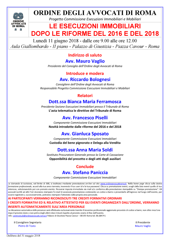 Si segnala il seminario, organizzato dal gruppo "Progetto esecuzioni immobiliari e mobiliari" del Consiglio dell'Ordine degli Avvocati di Roma, che si terrà presso l'Aula Giallombardo presso la Suprema Corte di Cassazione, in Palazzo di Giustizia di Piazza Cavour a Roma, lunedì 11 giugno 2018 dalle ore 9.00 alle ore 12.00.